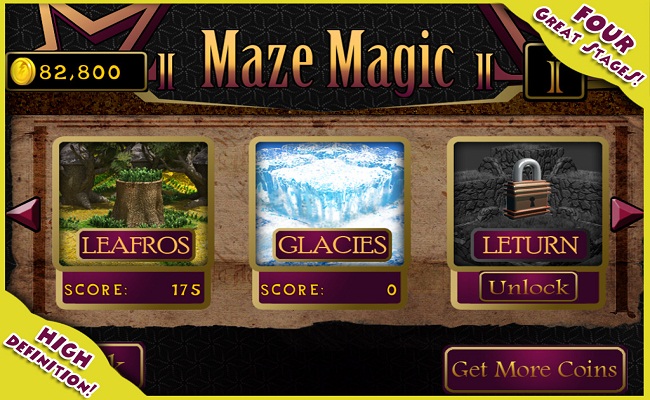 Coins are the currency of Maze Magic, and they can be used to purchase upgrades for your wizard or unlock new mazes. The list of upgrades is somewhat short, only including a new staff that shoots double spells and a few hats that can make your wizard speed up, turn invisible or attract potions. However, the bonuses are well worth it. Unlocking new mazes is an expensive purchase that will require players to repeatedly run through the same mazes to earn enough coins to try the different mazes and environments. There are four different environments total that have ten mazes apiece.