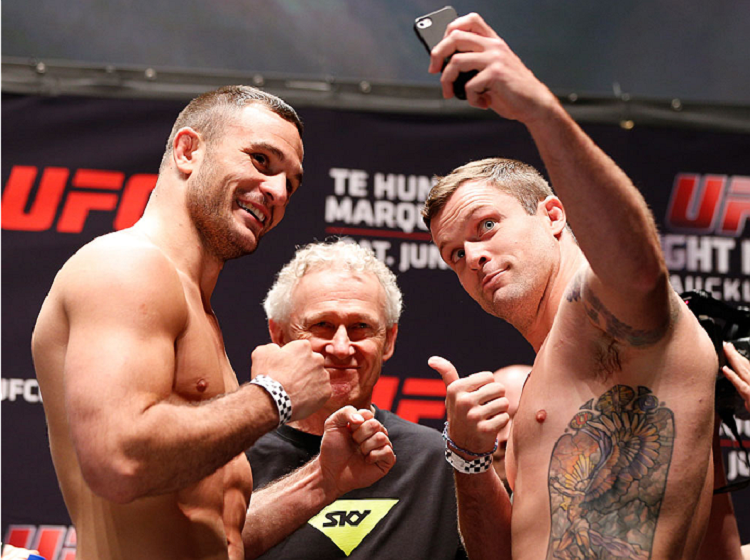 After the weigh-ins, the two warriors stare down fiercely at each other in a fighting pose in order to intimidate the opponent and to give the media a chance to get a good photo.