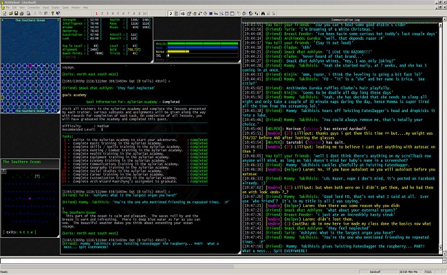 text-based titles like these the worlds vary insanely in size. On the up-side you never have to worry about rendering or lagging, on the down side the lack of graphics can put off potential players totally. So a crutch can be beneficial, in this case Aardwolf features a little map that is super handy if you are playing this on a PC. If you are at all familiar with Gemstone IV by Simutronics you know how tedious the command input lines can be. This is where things get technical and where the learning curve starts to put people off big time.