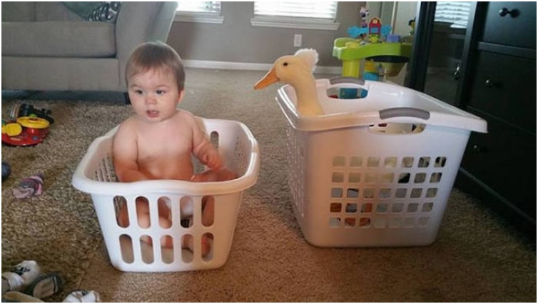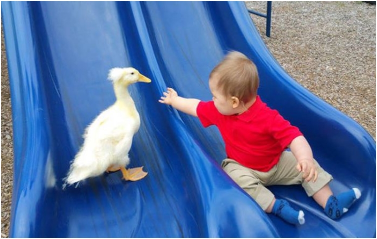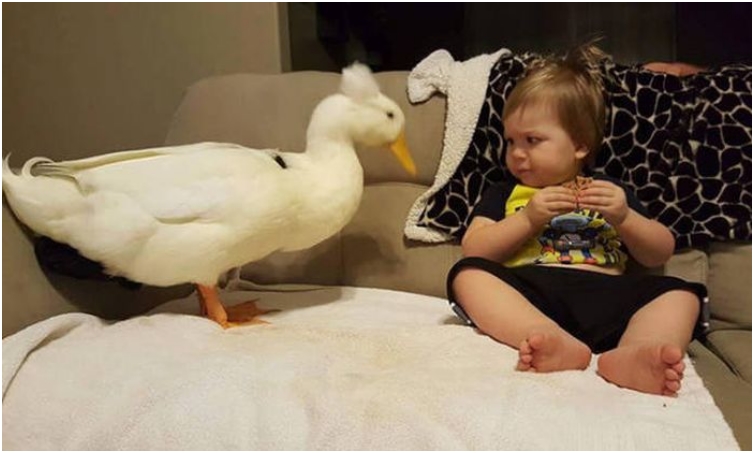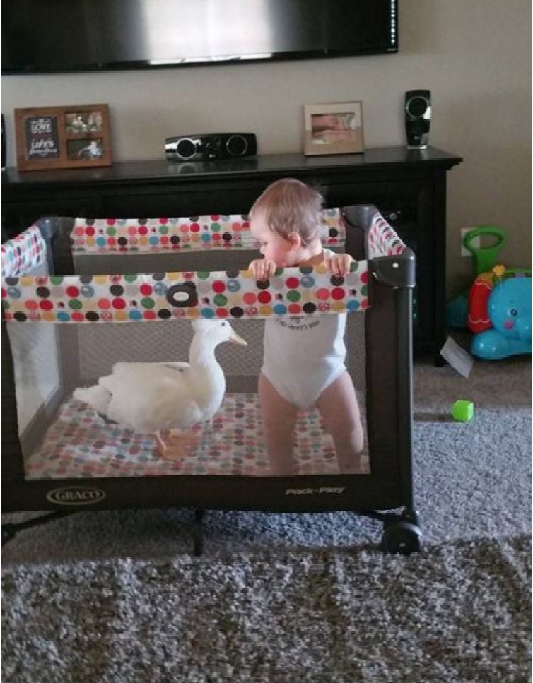 Baby Tyler and the duck Beaker bonded from the moment they set their eyes on each other and have been inseparable ever since.