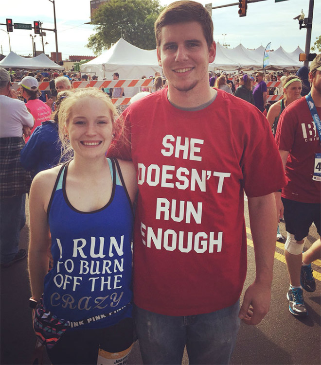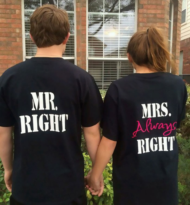 There are plenty of them to choose from. “I’m with stupid” or “”Keep calm and….” are probably some of the classics and most common, and then there are t-shirt pairs such as the ones in this list.
