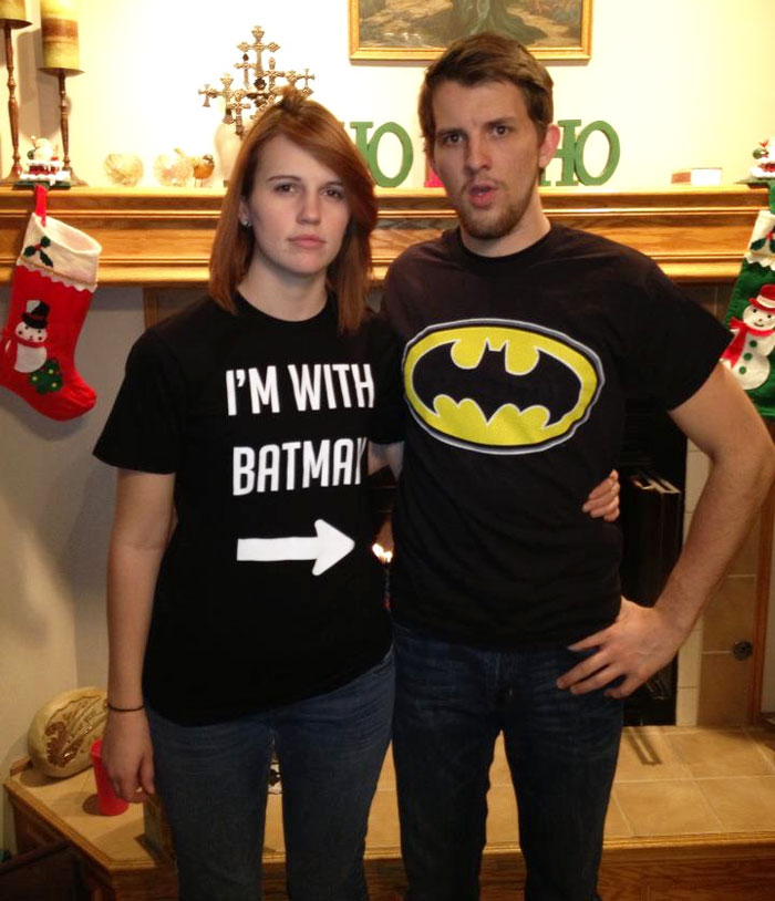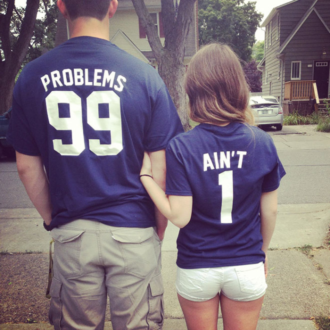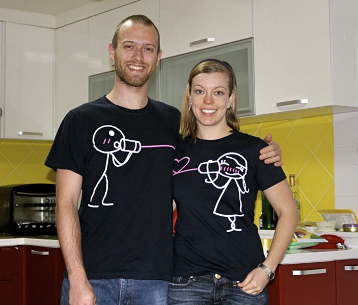 There are plenty of them to choose from. “I’m with stupid” or “”Keep calm and….” are probably some of the classics and most common, and then there are t-shirt pairs such as the ones in this list.