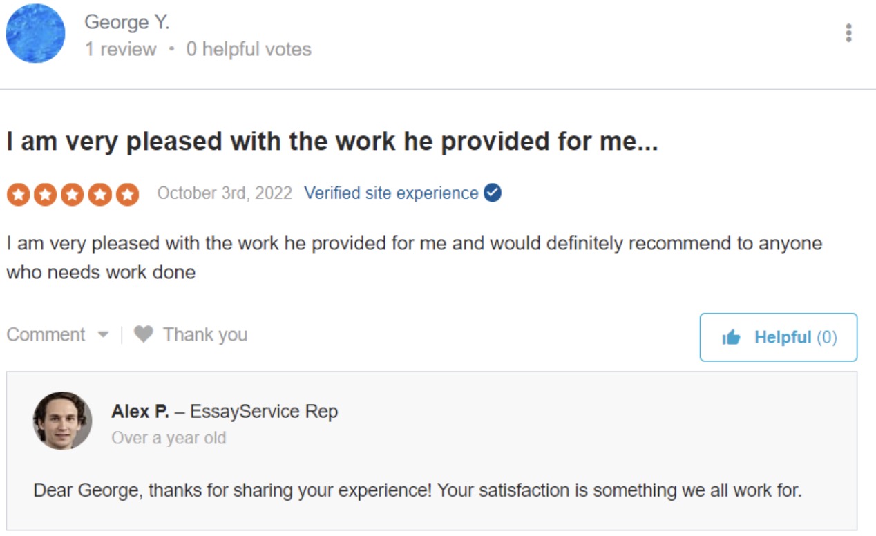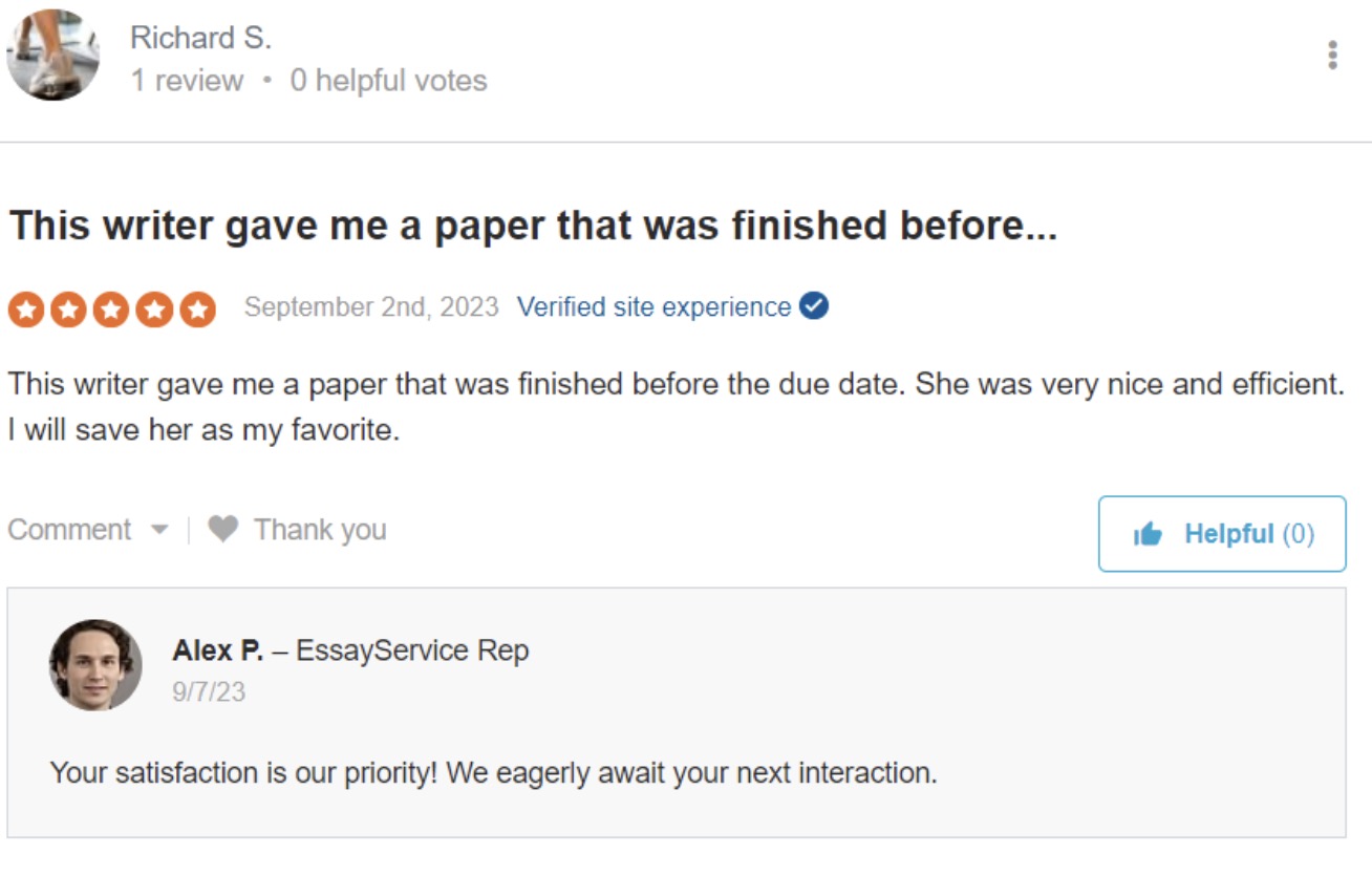 After interacting with EssayService, my overall impression is quite positive. The paper I received matched the academic requirements and my personal expectations. Notably, the service has a good online reputation, with hundreds of students leaving commendable reviews.