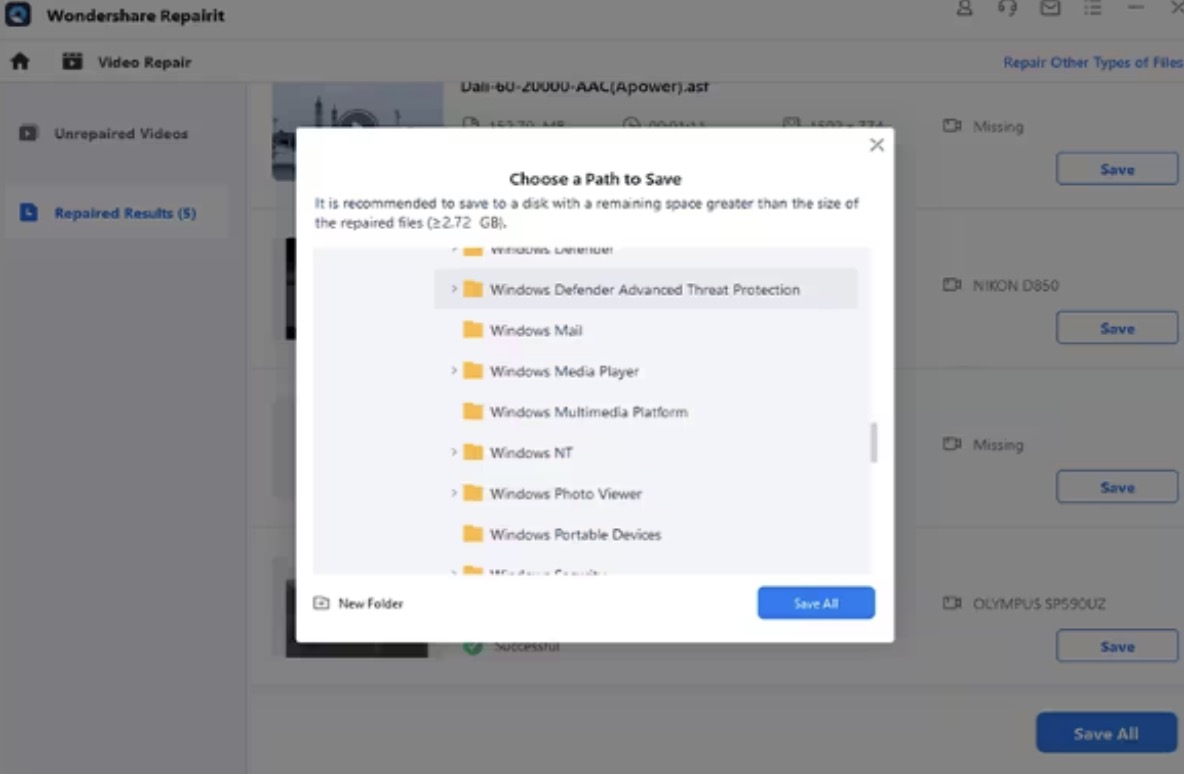 Choose an MP4 format sample video and click “Save” to save the successfully repaired MP4 videos to your desired location.