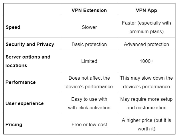VPN Extension Vs. VPN App: Comparison Table