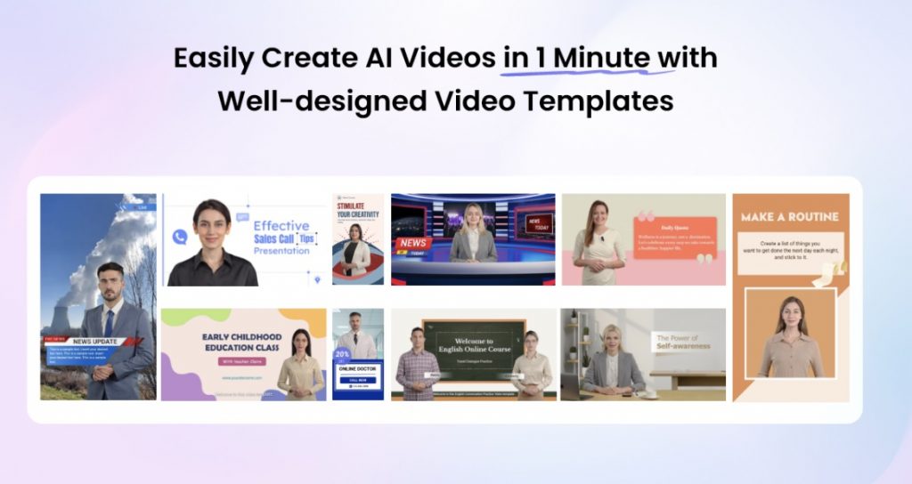 - Variety of pre-designed templates: Vidnoz AI offers over 2800 templates covering all kinds of scenarios, from training, and marketing to education, and finance. It can meet everyone’s requirements of creating a stunning video in one minute.