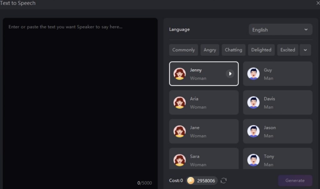 Good job! Time to create TTS now. Click on the ‘Generate’ button and the software will convert your text into speech. When the generation is done, you can open the folder to get its file or add it to the timeline.