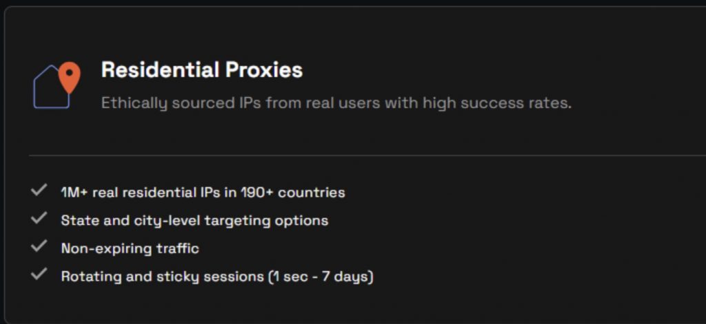 Residential proxies are the main product MarsProxies offers. They’re also the most comprehensive, with over one million rotating residential addresses in more than 190 countries. Here is what you’ll get when you opt for these proxies: