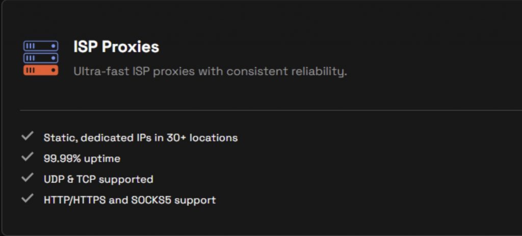 MarsProxies offers dedicated ISP proxies from internet service providers in more than 30 countries. Here’s what to expect from this plan: