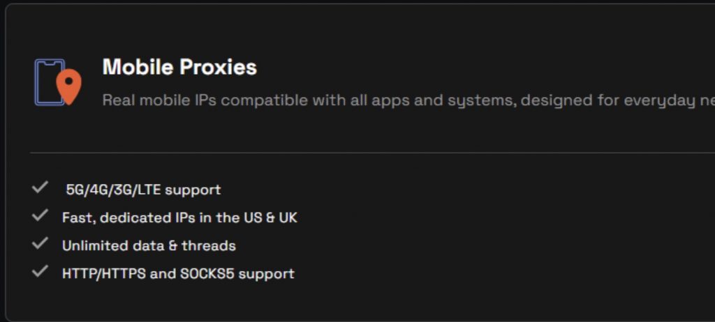 Mobile proxies are ideal if you want to appear as a genuine mobile device user. As expected, MarsProxies did not disappoint. It offers mobile residential IPs connected to real mobile devices, reducing the chances of detection. However, you only get the mobile servers in two, as MarsProxies puts it, “essential” locations—the US and the UK. Here’s what to expect: