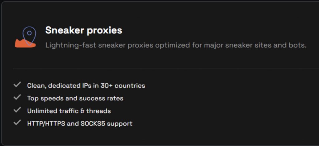 | Residential, datacenter, ISP, sneaker, and mobile proxies available | |