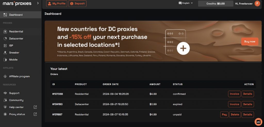 Signing up for a MarsProxies account is pretty easy. We did it in a couple of seconds by providing our email address and password, followed by a quick email verification. Below is the dashboard: