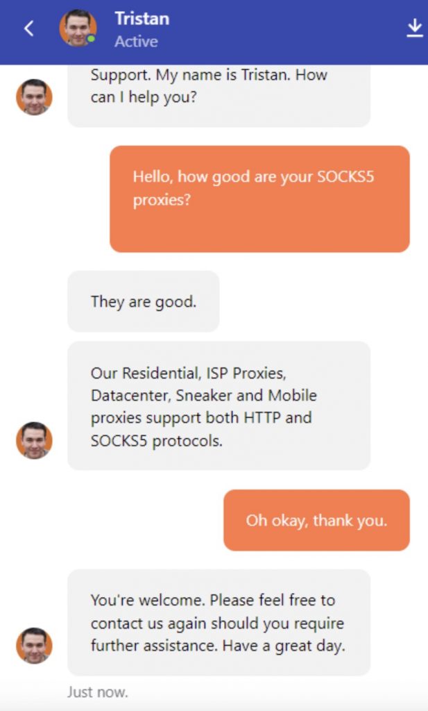 MarsProxies offers 24/7 customer support via multiple channels, including email, live chat, and Discord. We initiated a conversation with customer support via live chat, as shown in the screen grab below, and got a response from an agent in under a minute.
