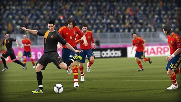 After loading the game and watching the wonderfully upbeat introduction, featuring an iconic floral theme and music that sounds like it belongs in last year’s Eurovision song contest, you’ll notice that the nicely animated in-game menus offer gamers a chance to compete in a great deal more than just the UEFA EURO 2012 tournament. “Challenge” mode, as akin to FIFA 12’s “Challenge” mode, pits you in situations adapted from real life EURO games, whether it be helping Spain overturn a 1-0 deficit against the Czech Republic or by winning the grand final of the tournament whilst playing as the team that actually lost in real life. “Expedition” mode seems to be the one that fans expected least, and that’s probably because it fits awkwardly into the overall bundle that EURO 2012 offers its players. Here, you select one famous player from an existing team (or import your Virtual Pro) and battle it out across Europe with a team of generic nobodies. As you win games you unlock better players for your squad (ultimately assembling a European dream team) and roads to other countries around the globe, however when you lose games you ultimately break those links – leaving you to retry games as you make errors. This mode, whilst not in the exact spirit of the occasion, is definitely interesting to play through as an offline experience and the addition of collecting “mosaics” for winning games definitely adds a lot more spice to the competition. Finally, the tournament itself (along with the online counterpart) is back in full swing and offers fans what I imagine they’d pretty much expect: the full 8 stadiums, group stages, in-game updates and the subsequent dramatic series of knockout stages.