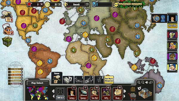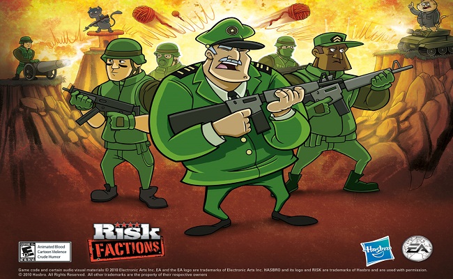Risk: Factions differs and attempts to improve on the classic Risk game by adding several different gameplay elements. There are three different factions to play as: human, zombie and cat. However, everyone must start out playing human. The special bonus cards that you can play for an advantage vary with each faction, which is the main difference, aside from appearance. Each player also has a base that they can visit between or during matches. The base is primarily used to farm reserve troops and weapons to use during your matches. Like Risk the board game, you can only place a certain number of troops on your turn based on the territories you control. However, in Risk: Factions, the troops that you place must all be taken from the reserves that you train and farm at your base. Troops cost money to train, which you can earn by rolling successful attacks during matches.