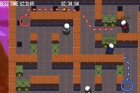 The game adopts a simplistic approach to a genre that’s been tapped into more times this console generation than Rupert Murdoch’s external hard drive, but never quite like this. You play as two convicts (who for the purpose of this review I have named Red and Blue, although their names aren’t distinctly clear) who are attempting to escape a high-security prison with just a handful of bullets and a whopping knife that would make even Crocodile Dundee proud to know ya’. You work on your own (but sort of as a team) as you control the two criminals from a top-down Birdseye perspective, drawing paths for each character as they progress through the maze-like levels. The controls are easy peasy thanks to a simplistic swipe interface and the way Touchy have approached the task of zooming in and out of the map is respectful of how the iPhone handles photos and books, with a two-finger prod and pull technique.