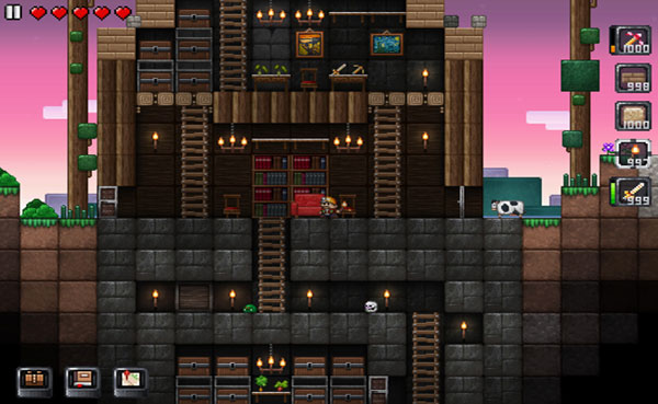 At night, or once far underground, the game becomes about survival. Using a background and foreground, players can create charming structures to protect themselves from the outside world, and decorate them with a variety of items. Couches and tables are basic pieces of furniture, but the more experimental players will discover how to make vases, paintings, and much more to create some very cool buildings.